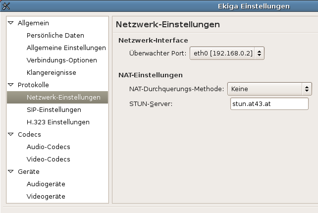 Bei der Installation von Ekiga wird der Konfigurations-Druide aufgerufen. Dabei ist es wichtig das Kästchen anzuklicken - "Ich möchte mich nicht beim kostenlosen ekiga.net Dienst anmelden.". In der folgenden Konfiguration ist die Matrikelnummer a9826090 durch die eigene zu ersetzen. Die NAT Konfiguration ist gegebenenfalls auch anzupassen.